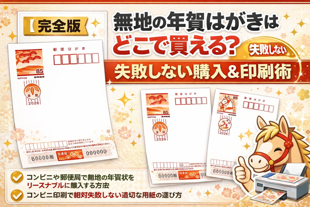もしコンビニのコピー機に持ち込んで印刷するつもりなら、必ずコーティングのない「普通紙」の無地年賀はがきを選ぶという技術的制約があることを覚えておいてください。